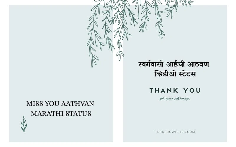 We understand that no video can replace the warmth of a mother’s hug or the comfort of her words, but स्वर्गवासी आईची आठवण व्हिडीओ स्टेटस can help you share your feelings and keep her spirit alive among your loved ones. Download your preferred स्वर्गवासी आईची आठवण व्हिडीओ स्टेटस from Terrific Wishes today and pay a beautiful digital tribute to your beloved mother. Remember, her love never leaves – it simply transforms into eternal memories that live in your heart forever. 🙏💖